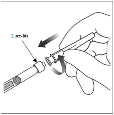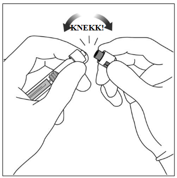 For å bryte av (ikke vri av) hetten på sprøyten skal du holde sprøyten i den ene hånden, mens du bruker den andre hånden til å ta tak i sprøytehetten med tommel- og pekefinger. Merk: Ikke trekk tilbake stempelstangen. |