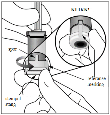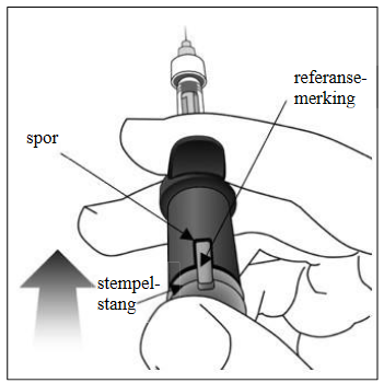 For å fjerne alle boblene og overflødig legemiddel, presses stempelet langsomt ned (venstre bilde under) til den stopper, dvs. når referansemerkingen på stempelstangen når frem til fingergrepet (høyre bilde under).