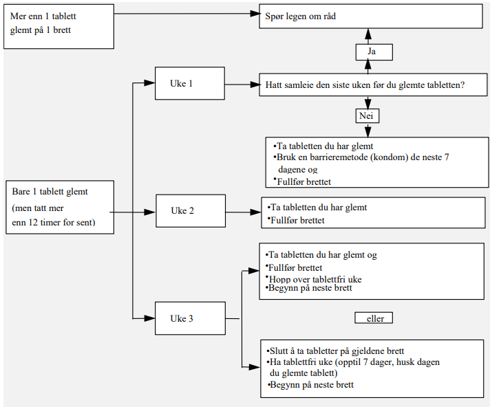 Risikoen for at beskyttelsen mot graviditet er redusert, er størst dersom du glemmer en tablett på begynnelsen eller slutten av brettet. Følgende regler gjelder for denne situasjonen (se diagrammet nedenfor):
