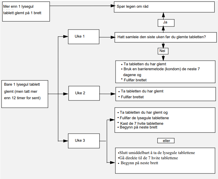 Risikoen for at beskyttelsen mot graviditet er redusert, er størst dersom du glemmer en lysegul tablett på begynnelsen eller slutten av brettet. Følgende regler gjelder for denne situasjonen (se diagrammet nedenfor):