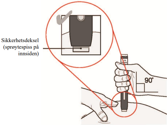 Fortsett å holde huden strukket/sammenklemt. Med hetten av, plasser pennens sikkerhetsdeksel på huden i en vinkel på 90 grader. Sprøytespissen er inni sikkerhetsdekslet.