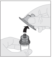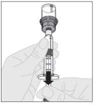 14. Sørg for at sprøytestempelet er presset helt inn og vend hetteglasset opp-ned. Trekk stempelstangen langsomt ut for å trekke opp all oppløsningen gjennom hetteglassadapteren og inn i sprøyten.