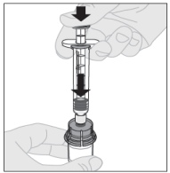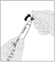 Merk: Dersom oppløsningen ikke skal brukes med én gang, kan sprøytehetten settes forsiktig tilbake på sprøytetuppen. Ikke berør sprøytetuppen eller innsiden av hetten.