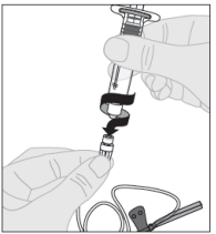 10. Fest sprøyten med væske til hetteglassadapteren ved å stikke sprøytetuppen inn i adapteråpningen. Skyv bestemt og skru sprøyten med klokken til den er godt festet.