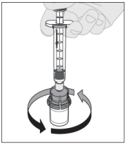 12. Med sprøyten fortsatt festet til adapteren og stempelstangen presset ned, roter hetteglasset forsiktig til pulveret er oppløst.