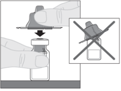 6. Sett hetteglasset på en jevn overflate. Hold hetteglassadapteren i beskyttelseshetten og plasser den rett over toppen av hetteglasset. Trykk bestemt ned til adapteren smekker på plass på toppen av hetteglasset, og spissen på adapteren har trengt igjennom proppen på hetteglasset.