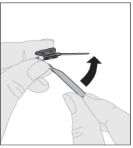 5. Etter at injeksjonen er fullført og kanylen er fjernet, skal du bøye nålbeskyttelsen til den smekker på plass over kanylen.