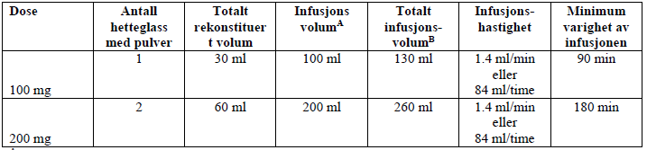 Infusjonshastigheten bør ikke overstige 1,1 mg/min (som tilsvarer 1,4 ml/min eller 84 ml/time når tilberedt og fortynnet som anvist i instruksjonen).