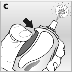 Utløserknappen må trykkes ordentlig inn for å frigjøre dosen gjennom neseapplikatoren - se bilde c.