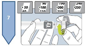 Still inn dosen legen har rådet deg til ved å vri på doseringknappen til den forskrevne dosen er synlig. Den valgte dosen må være på linje med prikken i doseringsvinduet. Om nødvendig kan dosen korrigeres ved å vri opp og ned på doseringsknappen.
