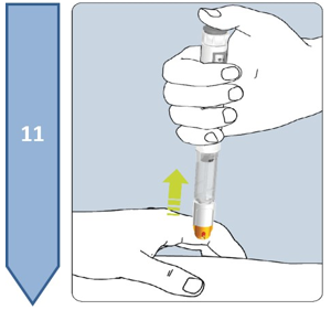 Fortsett å trykke ned trykknappen mens kanylen er i huden.