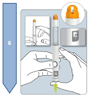 Hold pennen med kanylen vendt oppover og pass på at doseringsvinduet er vendt mot deg.