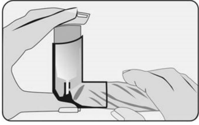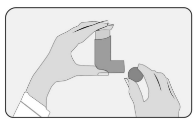 Dersom du har en ny inhalator, eller dersom du ikke har brukt inhalatoren på minst en uke, må den testes før du bruker den. Fjern beskyttelseshetten fra munnstykket og trykk ned beholderen inne i inhalatoren tre ganger for å utløse tre puff ut i luften – bort fra deg selv.