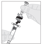 Merk: Dersom oppløsningen ikke skal brukes med én gang, kan sprøytehetten settes forsiktig tilbake på sprøytetuppen. Ikke berør sprøytetuppen eller innsiden av hetten.