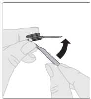 5. Etter at injeksjonen er fullført og kanylen er fjernet, skal du bøye nålbeskyttelsen til den smekker på plass over kanylen.