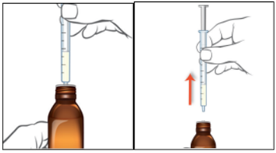 5. Trekk sprøytesylinderen langsomt tilbake, slik at det nødvendige volumet (antall ml) mikstur trekkes inn i sprøyten. Plasser stempelenden på linje med foreskrevet volummarkering, som vist på tegningen.