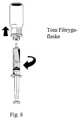 3. Når oppløsningen er overført, hold godt fast i sprøytesylinderen (hold sprøytestempelet vendt ned) og fjern sprøyten fra overføringssettet (Fig. 8).