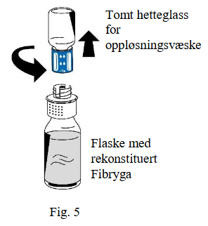 7. Mens hetteglasset med oppløsningsvæske fortsatt er festet på, virvles Fibryga-flasken forsiktig inntil pulveret er helt oppløst. For å unngå skumdannelse skal flasken ikke ristes. Pulveret skal være helt oppløst innen ca. 5 minutter. Det bør ikke ta mer enn 20 minutter å løse opp pulveret. Hvis pulveret ikke er oppløst innen 20 minutter, bør preparatet kastes.