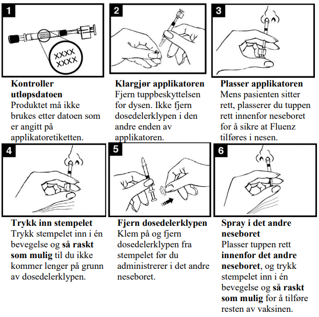 Fluenz vil bli gitt som spray i hvert nesebor. Du kan puste normalt mens du får Fluenz. Det er ikke nødvendig å aktivt inhalere eller puste inn gjennom nesen.