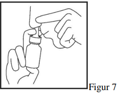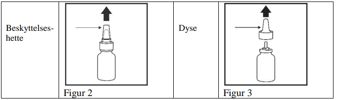3. Lukk ett nesebor ved å trykke med fingeren mot det og plasser sprayens dyse i det andre neseboret (Figur 7). Bøy hodet litt fremover slik at flasken holdes rett opp.