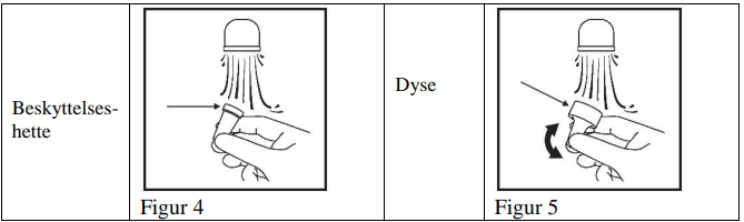 2. Legg dysen og beskyttelseshetten i varmt vann og la stå i noen minutter. Skyll deretter dysen og hetten under rennende vann (Figur 4 og 5).