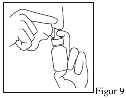 4. Pust langsomt inn gjennom det åpne neseboret, samtidig som du bestemt trykker kragen på dysen ned med fingrene for å sprute en fin spray inn i neseboret (Figur 8).