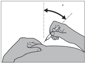 Trykk stempelet helt ned med langsom, jevn hastighet for å tilføre riktig dose. Hold hudfolden klemt mens du injiserer. Deretter slipper du opp hudfolden og trekker ut nålen.