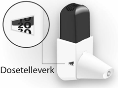Dosetelleren viser hvor mange doser som er igjen. Telleren flytter seg for hvert femte trykk. Når dosetellereren begynner å bli rød, er det 20 doser igjen.