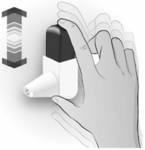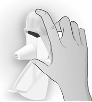 Hvordan tømme pulveret ut av munnstykket Dersom du ved uhell utløser inhalatoren eller du har utløst den mer enn én gang, eller hvis du puster rett inn i den, skal du tømme munnstykket.