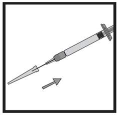 Ta et fast tak i sprøyten. Fest kanylen forsiktig til den ferdigfylte sprøyten med den fargeløse oppløsningen.