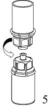 5. Med én hånd rundt IDELVION-delen av Mix2Vial-settet og den andre hånden rundt hetteglasset det har vært væske i, skrus settet forsiktig fra hverandre mot klokken i to deler. Kast hetteglasset til væsken med den blå Mix2Vial-adapteren tilkoblet.