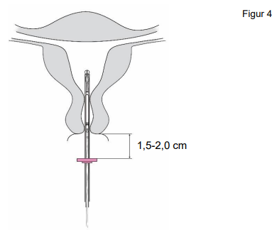 4. Mens glideknappen holdes i ytterste posisjon, føres innføringshylsen inn i cervix inntil måleringen er ca. 1,5-2,0 cm fra uterin cervix.
