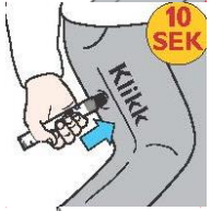 4. Press den sorte enden bestemt mot utsiden av låret til du hører et klikk, som indikerer at injeksjonen har startet. Hold injektoren fast mot låret i 10 sekunder (tell sakte til 10) og ta den ut. Den sorte enden går automatisk ut og skjuler nålen igjen.