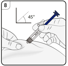 Trinn 8. Stikk inn nålen Klem forsiktig rundt huden på injeksjonsstedet og hold grepet gjennom hele injeksjonen. Stikk nålen inn i huden med den andre hånden i en vinkel på ca. 45 grader som vist. Ikke trykk på stempelet mens du stikker inn nålen. |