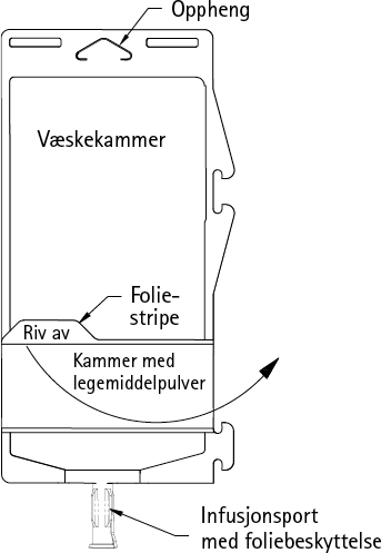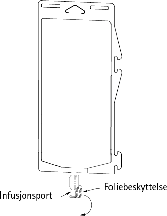 Fjern beskyttelsesfolien fra infusjonsporten og koble til det sterile administreringssettet (figur 5). Heng posen på et infusjonsstativ.