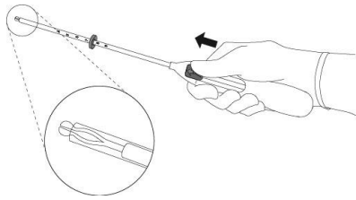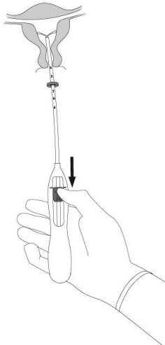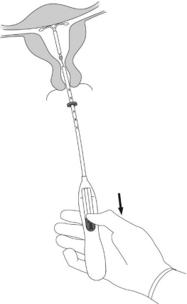 7. Mens du holder innføringshylsen på plass, frigjøres Mirena ved å skyve glideren helt tilbake (Figur 7). Mens du fortsatt holder glideren helt tilbake, fjernes innføringshylsen forsiktig ved å trekke den ut. Kutt trådene slik at 2-3 cm er synlig utenfor cervix.