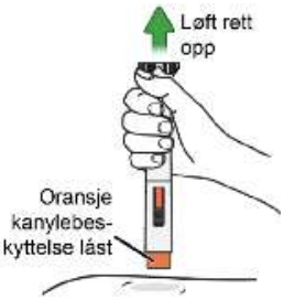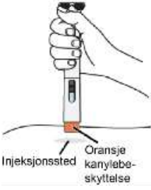 1. Plasser pennen på injeksjonsstedet vertikalt slik at den oransje kanylebeskyttelsen er flat mot huden.