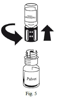 5. Mens hetteglassene fortsatt er festet til hverandre, sving hetteglasset med pulver forsiktig inntil pulveret er oppløst. Ved romtemperatur tar dette under 10 minutter. Lett skumming kan oppstå under tilberedningen. Skru overføringssettet fra hverandre i to deler (Figur 5). Skummet vil forsvinne.