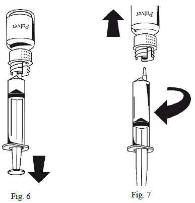 Oppløsningen i sprøyten skal være klar eller svakt opaliserende. Så snart oppløsningen er overført, hold stempelet på sprøyten fast (slik at det peker nedover) og fjern sprøyten fra overføringssettet (Figur 7). Kast det tomme hetteglasset sammen med den hvite delen av overføringssettet.