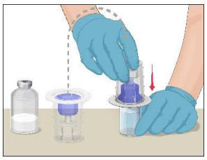 Den klargjorte oppløsningen i sprøyten skal kontrolleres for partikler og misfarging før administrering (løsningen skal være klar, fargeløs og uten partikler). Filteret i Mix2Vial-enheten fjerner disse partiklene helt. Filtreringen påvirker ikke doseberegningene. Oppløsningen i sprøyten skal ikke brukes hvis den er uklar eller inneholder flak eller partikler etter filtrering.