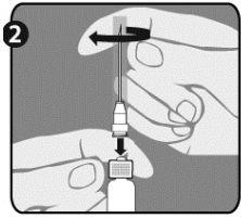 Etter fullført rekonstituering av vaksinen fjerner du lokket fra den andre nålen (som beskrevet i trinn 1 for nålene) og bytter ut nålen som ble brukt til rekonstituering med den andre nålen som skal brukes til administrasjon. Ikke bruk den samme nålen til rekonstituering og administrasjon.