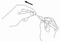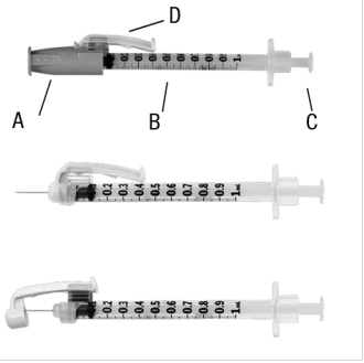 Hvis du bruker injeksjonssprøyte med nål som kan trekkes inn: IKKE PRESS STEMPLET HELT NED. Forsikre deg om at du stopper å presse stemplet når du føler motstand. Hvis du presser helt ned, så vil du høre en "klikkelyd". Dette betyr at sikkerhetsmekanismen har blitt aktivert, og nålen vil forsvinne inn i sprøyten. Dersom dette oppstår så kast produktet og begynn på nytt igjen ved å bruke et annet hetteglass og sprøyte.