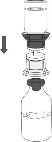 9. Plasser hetteglasset med Respreeza på en jevn og fast overflate. Snu hetteglasset med vann til injeksjonsvæsker med Mix2Vial-settet festet på, og stikk vertikalt hull i hetteglasset med Respreeza med den gjennomsiktige spissen på Mix2Vial-settet (figur 4). Vannet til injeksjonsvæsker vil automatisk overføres til hetteglasset med Respreeza.