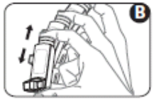 3. Ryst inhalatoren 4 eller 5 ganger for å være sikker på at alle løse gjenstander fjernes, og at innholdet i beholderen blandes godt (figur B).