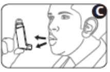 4. Hold inhalatoren loddrett med tommelen i bunnen, under munnstykket. Pust helt ut, så lenge du synes det er behagelig (figur C).