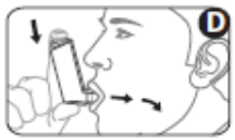 6. Pust sakte og dypt inn gjennom munnen. Rett etter at du begynner å puste inn, trykker bestemt du på toppen av beholderen for å frigjøre 1 dose legemiddel. Gjør dette mens du samtidig puster dypt og rolig inn (figur D).