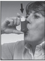 2. For å være sikker på at den virker, rist inhalatoren godt, hold munnstykket slik at det peker fra deg og trykk på beholderen for å frigjøre to doser i luften. Det samme bør gjøres dersom du ikke har brukt inhalatoren på 1 uke eller mer.