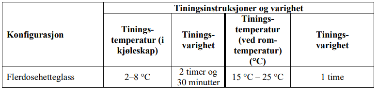 Tabell 2. Tiningsinstruksjoner for flerdosehetteglass før bruk