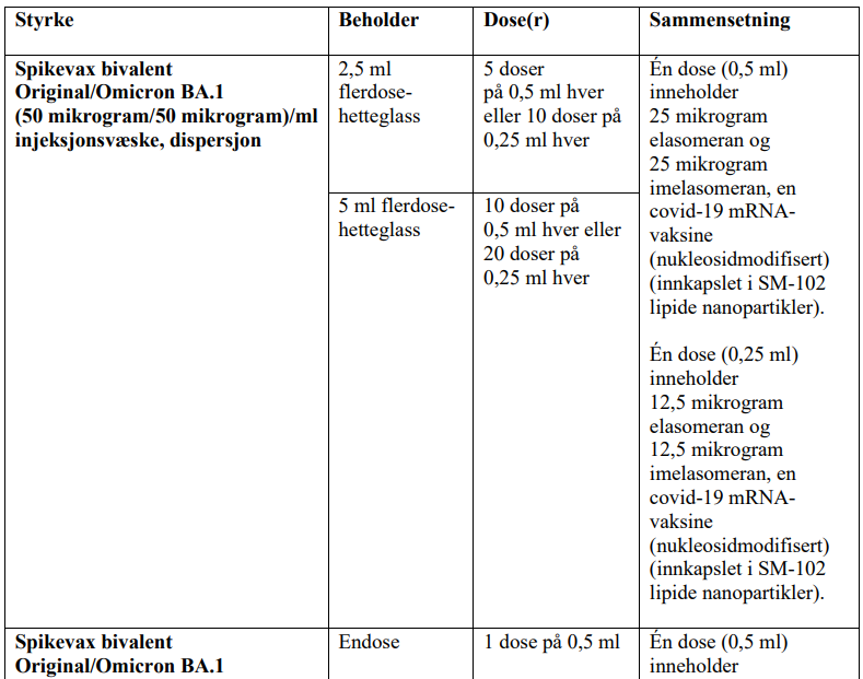 Spikevax bivalent Original/Omicron BA.1 leveres som i en ferdigfylt sprøyte (uten kanyle) med endose, og inneholder 0,5 ml (25 mikrogram elasomeran og 25 mikrogram imelasomeran) mRNA og må tines før administrering.