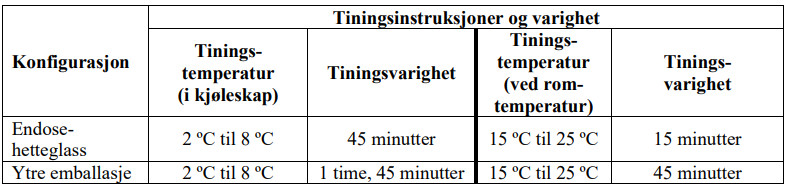 Tin hver ferdigfylte sprøyte før bruk ved å følge instruksjonene nedenfor. Sprøytene må tines i blisterpakningene (hvert blister inneholder 2 ferdigfylte sprøyter) eller i egen ytre emballasje, enten i kjøleskap eller i romtemperatur (tabell 4).